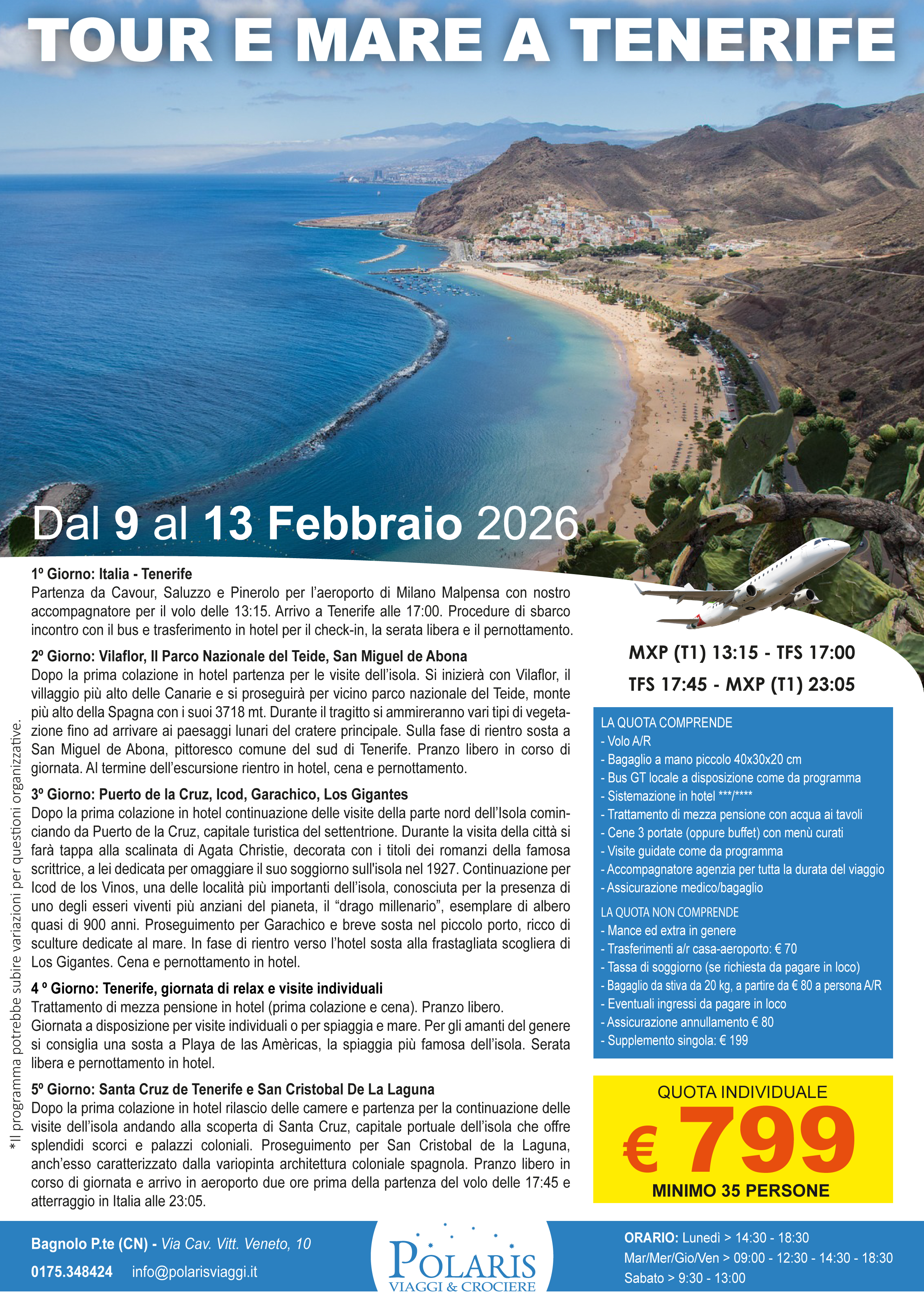 Partenza da Cavour, Saluzzo e Pinerolo per l’aeroporto di Milano Malpensa con nostro accompagnatore per il volo delle 13:15. Arrivo a Tenerife alle 17:00. Procedure di sbarco incontro con il bus e trasferimento in hotel per il check-in, la serata libera e il pernottamento.