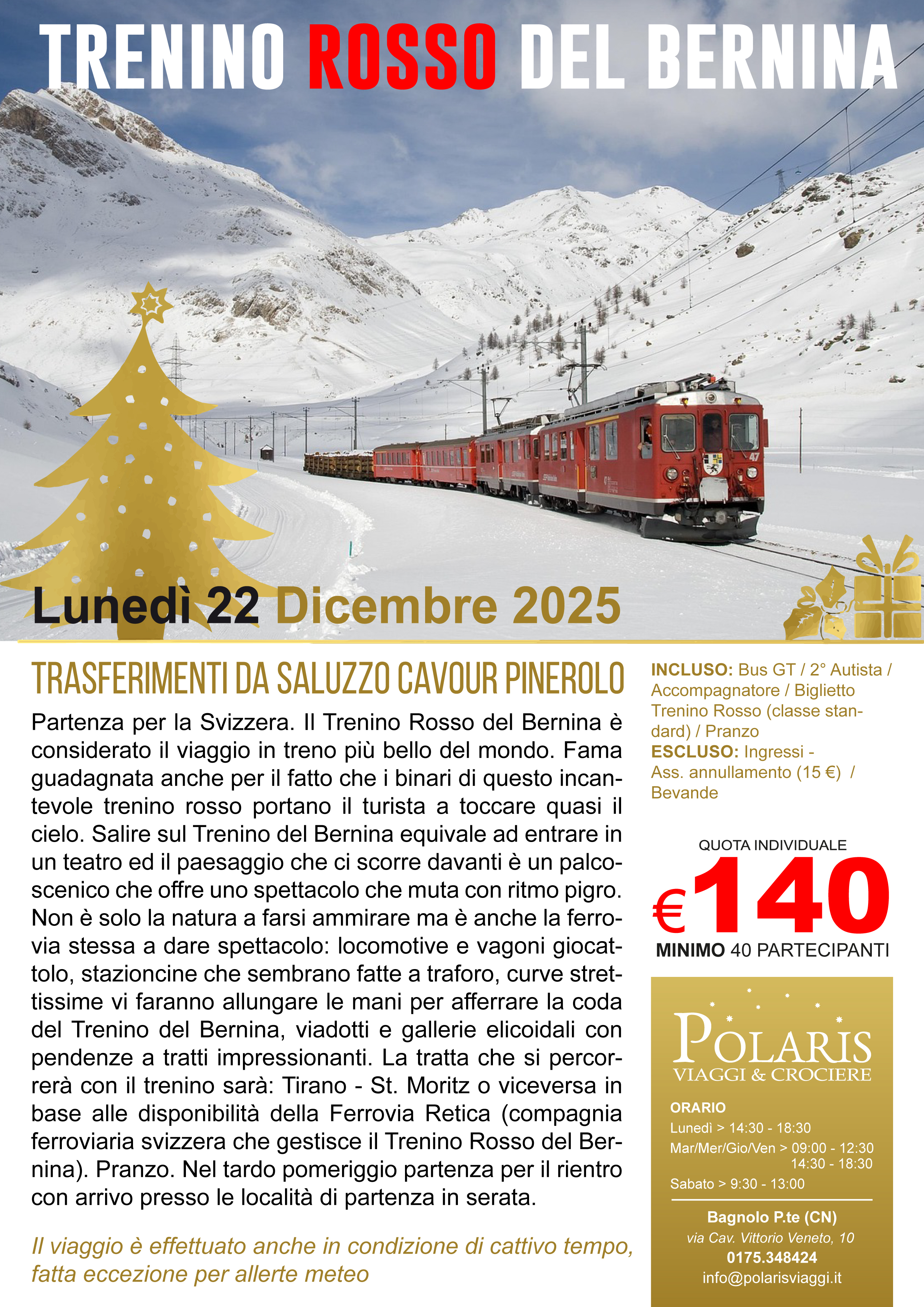 Partenza per la Svizzera. Il Trenino Rosso del Bernina è considerato il viaggio in treno più bello del mondo. Fama guadagnata anche per il fatto che i binari di questo incantevole trenino rosso portano il turista a toccare quasi il cielo. Salire sul Trenino del Bernina equivale ad entrare in un teatro ed il paesaggio che ci scorre davanti è un palcoscenico che offre uno spettacolo che muta con ritmo pigro. Non è solo la natura a farsi ammirare ma è anche la ferrovia stessa a dare spettacolo: locomotive e vagoni giocattolo, stazioncine che sembrano fatte a traforo, curve strettissime vi faranno allungare le mani per afferrare la coda del Trenino del Bernina, viadotti e gallerie elicoidali con pendenze a tratti impressionanti. La tratta che si percorrerà con il trenino sarà: Tirano - St. Moritz o viceversa in base alle disponibilità della Ferrovia Retica (compagnia ferroviaria…