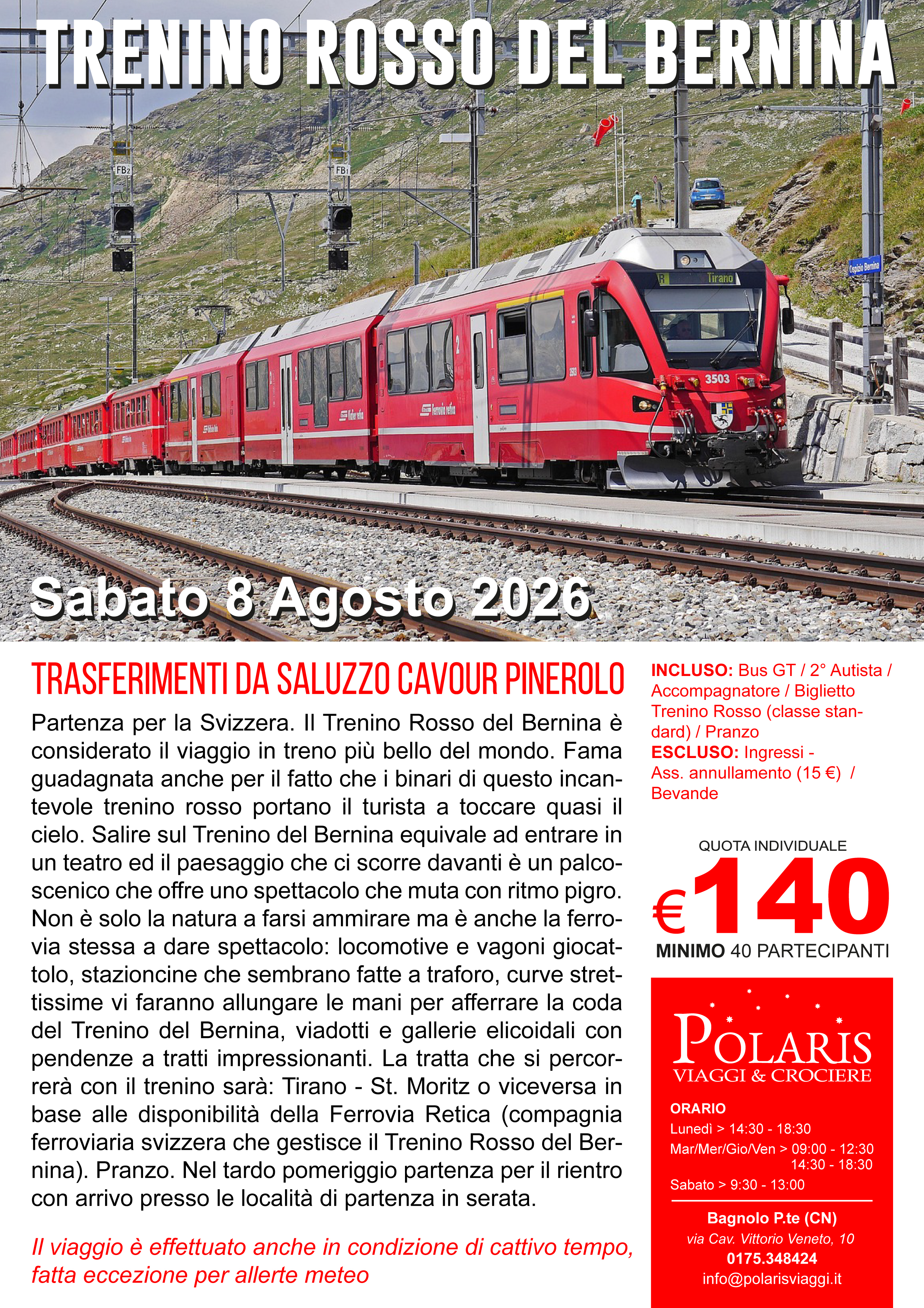Partenza per la Svizzera. Il Trenino Rosso del Bernina è considerato il viaggio in treno più bello del mondo. Fama guadagnata anche per il fatto che i binari di questo incantevole trenino rosso portano il turista a toccare quasi il cielo. Salire sul Trenino del Bernina equivale ad entrare in un teatro ed il paesaggio che ci scorre davanti è un palcoscenico che offre uno spettacolo che muta con ritmo pigro. Non è solo la natura a farsi ammirare ma è anche la ferrovia stessa a dare spettacolo: locomotive e vagoni giocattolo, stazioncine che sembrano fatte a traforo, curve strettissime vi faranno allungare le mani per afferrare la coda del Trenino del Bernina, viadotti e gallerie elicoidali con pendenze a tratti impressionanti. La tratta che si percorrerà con il trenino sarà: Tirano - St. Moritz o viceversa in base alle disponibilità della Ferrovia Retica (compagnia ferroviaria…