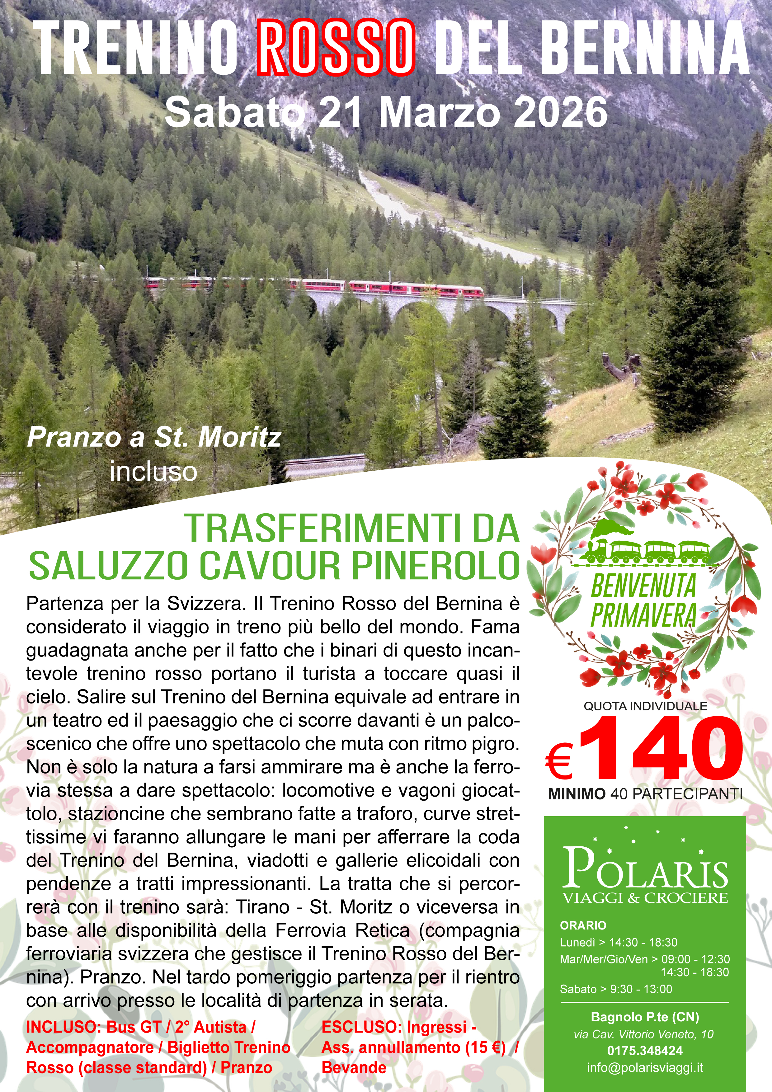 Partenza per la Svizzera. Il Trenino Rosso del Bernina è considerato il viaggio in treno più bello del mondo. Fama guadagnata anche per il fatto che i binari di questo incantevole trenino rosso portano il turista a toccare quasi il cielo. Salire sul Trenino del Bernina equivale ad entrare in un teatro ed il paesaggio che ci scorre davanti è un palcoscenico che offre uno spettacolo che muta con ritmo pigro. Non è solo la natura a farsi ammirare ma è anche la ferrovia stessa a dare spettacolo: locomotive e vagoni giocattolo, stazioncine che sembrano fatte a traforo, curve strettissime vi faranno allungare le mani per afferrare la coda del Trenino del Bernina, viadotti e gallerie elicoidali con pendenze a tratti impressionanti. La tratta che si percorrerà con il trenino sarà: Tirano - St. Moritz o viceversa in base alle disponibilità della Ferrovia Retica (compagnia ferroviaria…
