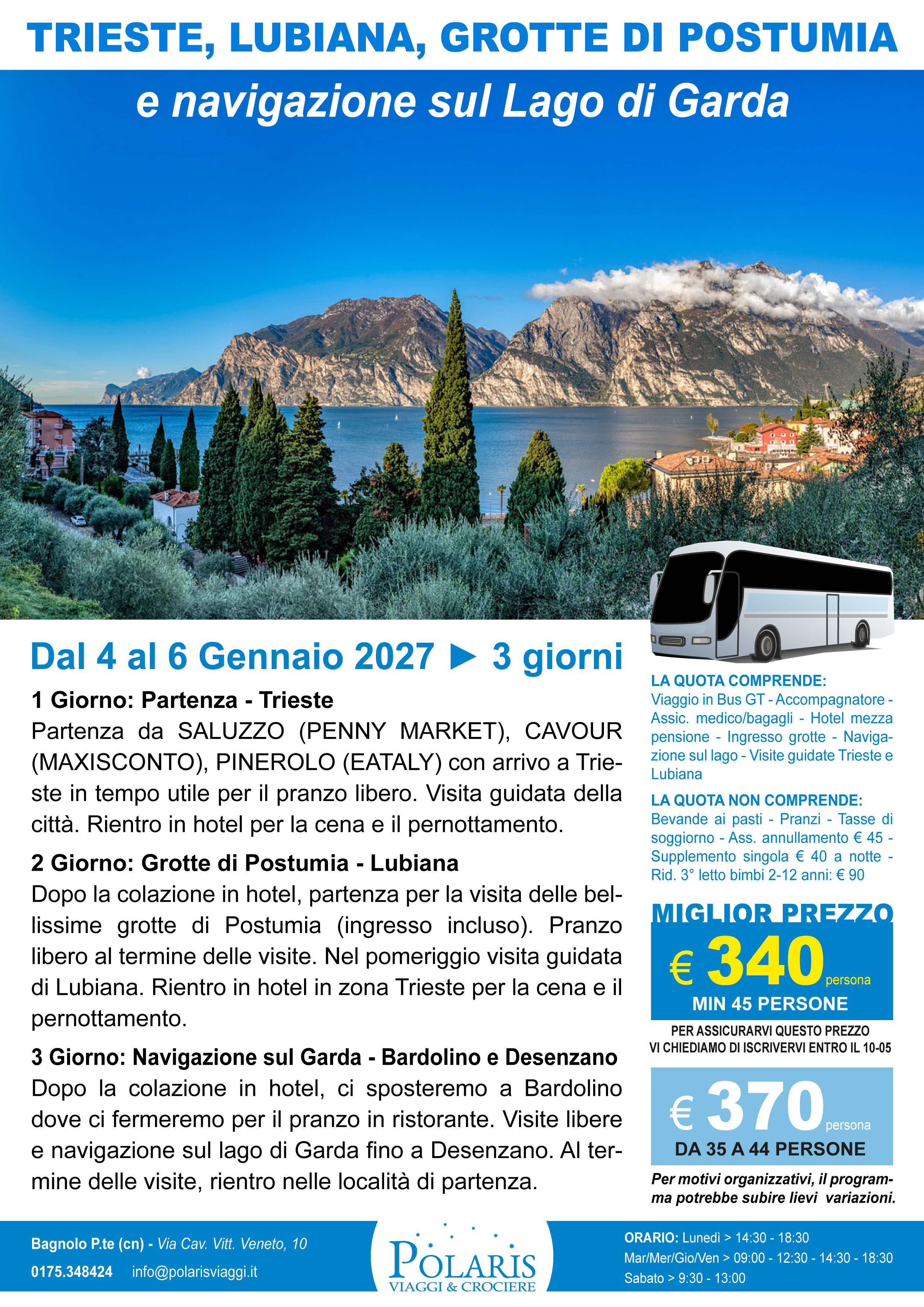 Partenza da SALUZZO (PENNY MARKET), CAVOUR (MAXISCONTO), PINEROLO (EATALY) con arrivo a Trieste in tempo utile per il pranzo libero. Visita guidata della città. Rientro in hotel per la cena e il pernottamento.