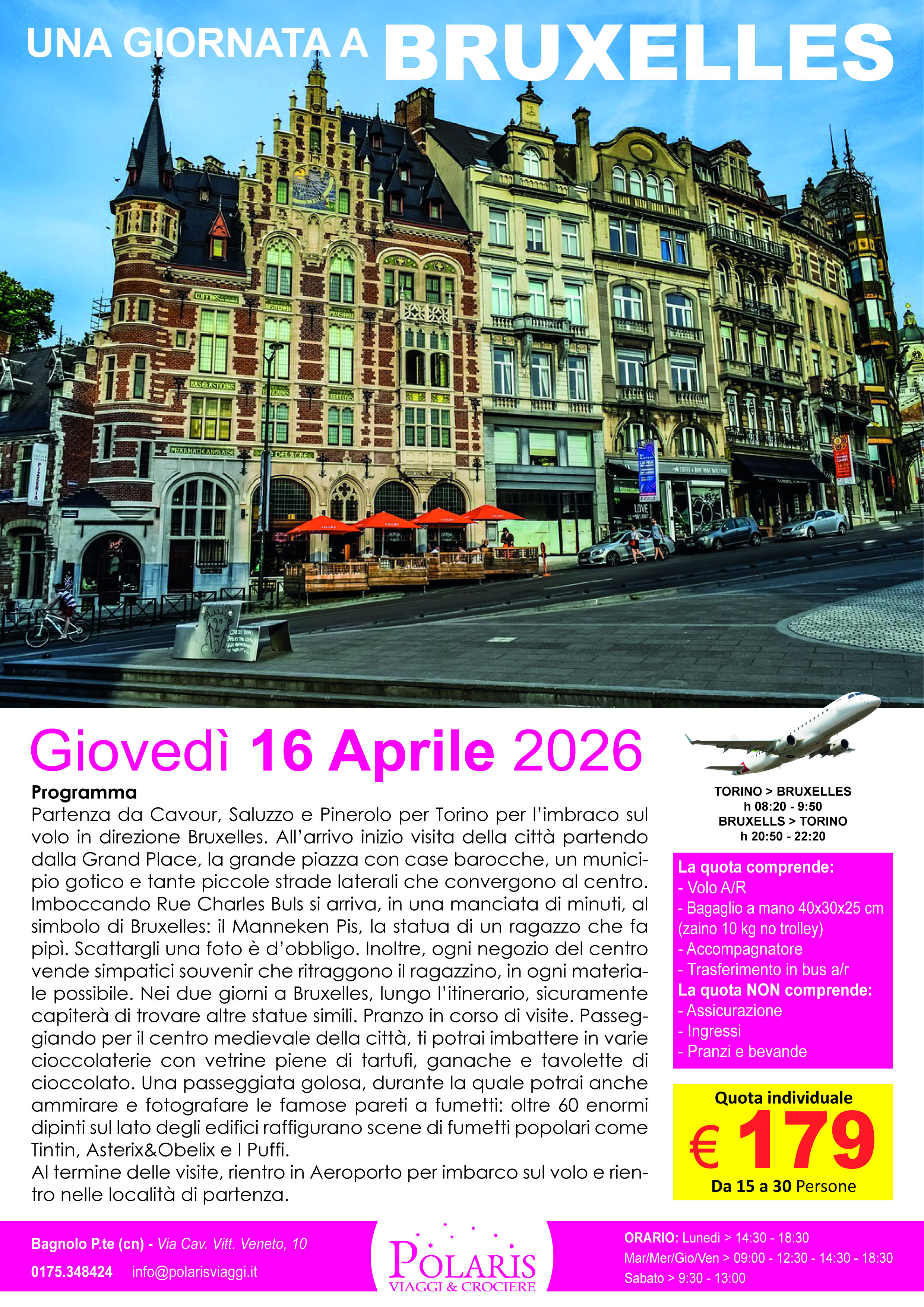 Partenza da Cavour, Saluzzo e Pinerolo per Torino per l’imbraco sul volo in direzione Bruxelles. All’arrivo inizio visita della città partendo dalla Grand Place, la grande piazza con case barocche, un municipio gotico e tante piccole strade laterali che convergono al centro. Imboccando Rue Charles Buls si arriva, in una manciata di minuti, al simbolo di Bruxelles: il Manneken Pis, la statua di un ragazzo che fa pipì. Scattargli una foto è d’obbligo. Inoltre, ogni negozio del centro vende simpatici souvenir che ritraggono il ragazzino, in ogni materiale possibile. Nei due giorni a Bruxelles, lungo l’itinerario, sicuramente capiterà di trovare altre statue simili. Pranzo in corso di visite. Passeggiando per il centro medievale della città, ti potrai imbattere in varie cioccolaterie con vetrine piene di tartufi, ganache e tavolette di cioccolato. Una passeggiata golosa, durante la quale potrai anche ammirare e fotografare le famose pareti a…