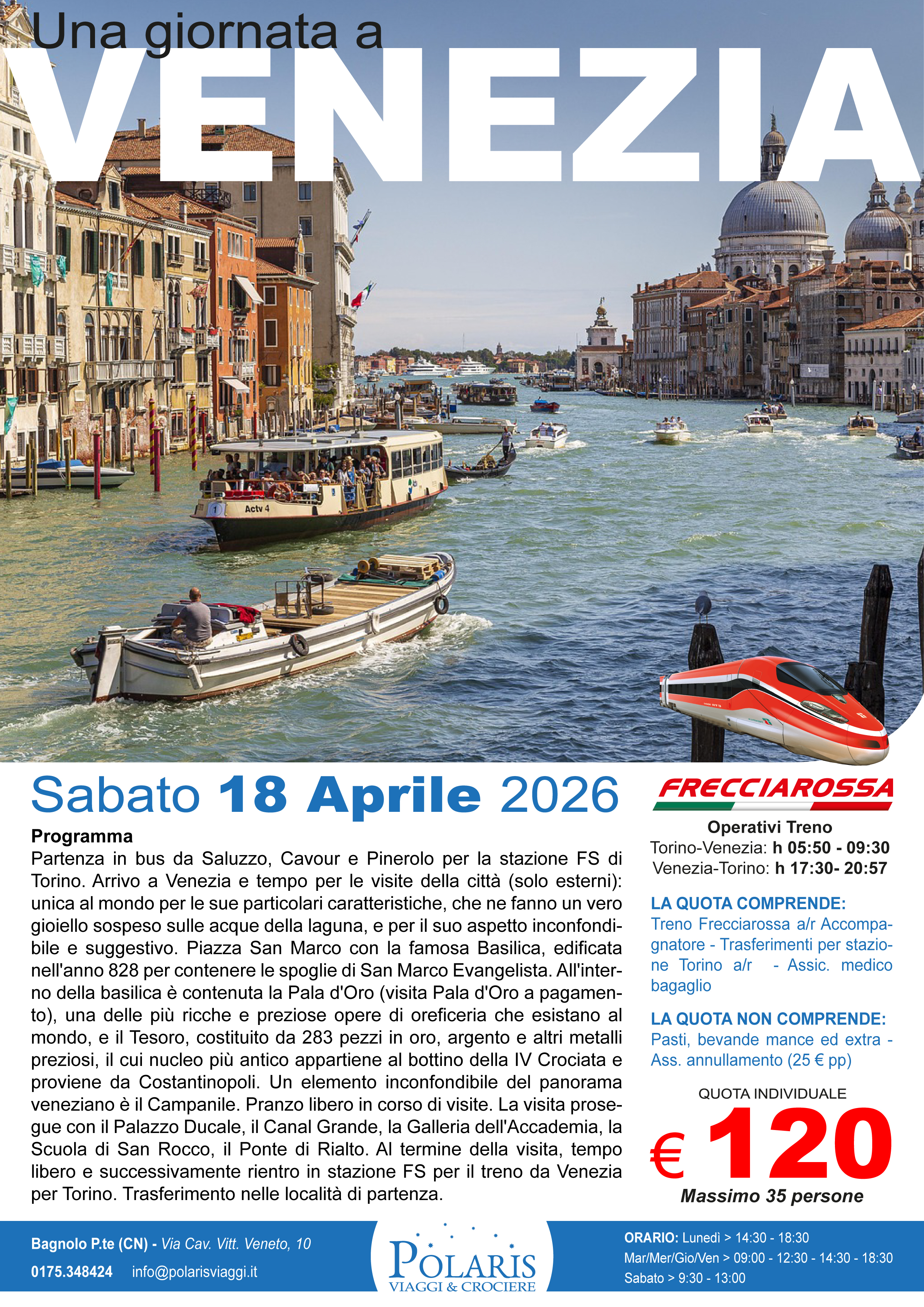Partenza in bus da Saluzzo, Cavour e Pinerolo per la stazione FS di Torino. Arrivo a Venezia e tempo per le visite della città (solo esterni): unica al mondo per le sue particolari caratteristiche, che ne fanno un vero gioiello sospeso sulle acque della laguna, e per il suo aspetto inconfondibile e suggestivo. Piazza San Marco con la famosa Basilica, edificata nell'anno 828 per contenere le spoglie di San Marco Evangelista. All'interno della basilica è contenuta la Pala d'Oro (visita Pala d'Oro a pagamento), una delle più ricche e preziose opere di oreficeria che esistano al mondo, e il Tesoro, costituito da 283 pezzi in oro, argento e altri metalli preziosi, il cui nucleo più antico appartiene al bottino della IV Crociata e proviene da Costantinopoli. Un elemento inconfondibile del panorama veneziano è il Campanile. Pranzo libero in corso di visite. La visita prosegue con il…