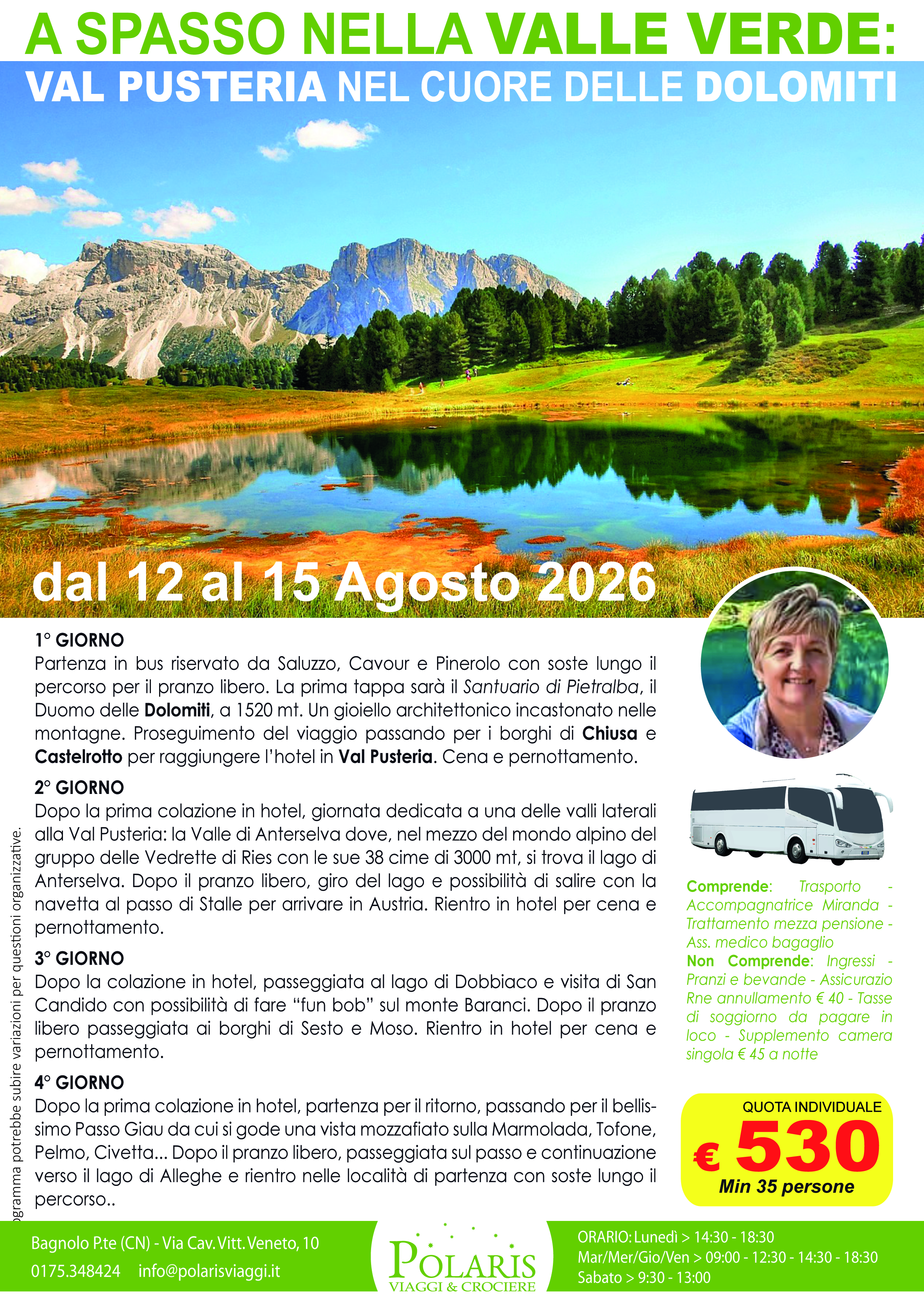 Partenza in bus riservato da Saluzzo, Cavour e Pinerolo con soste lungo il percorso per il pranzo libero. La prima tappa sarà il Santuario di Pietralba, il Duomo delle Dolomiti, a 1520 mt. Un gioiello architettonico incastonato nelle montagne. Proseguimento del viaggio passando per i borghi di Chiusa e Castelrotto per raggiungere l’hotel in Val Pusteria. Cena e pernottamento.