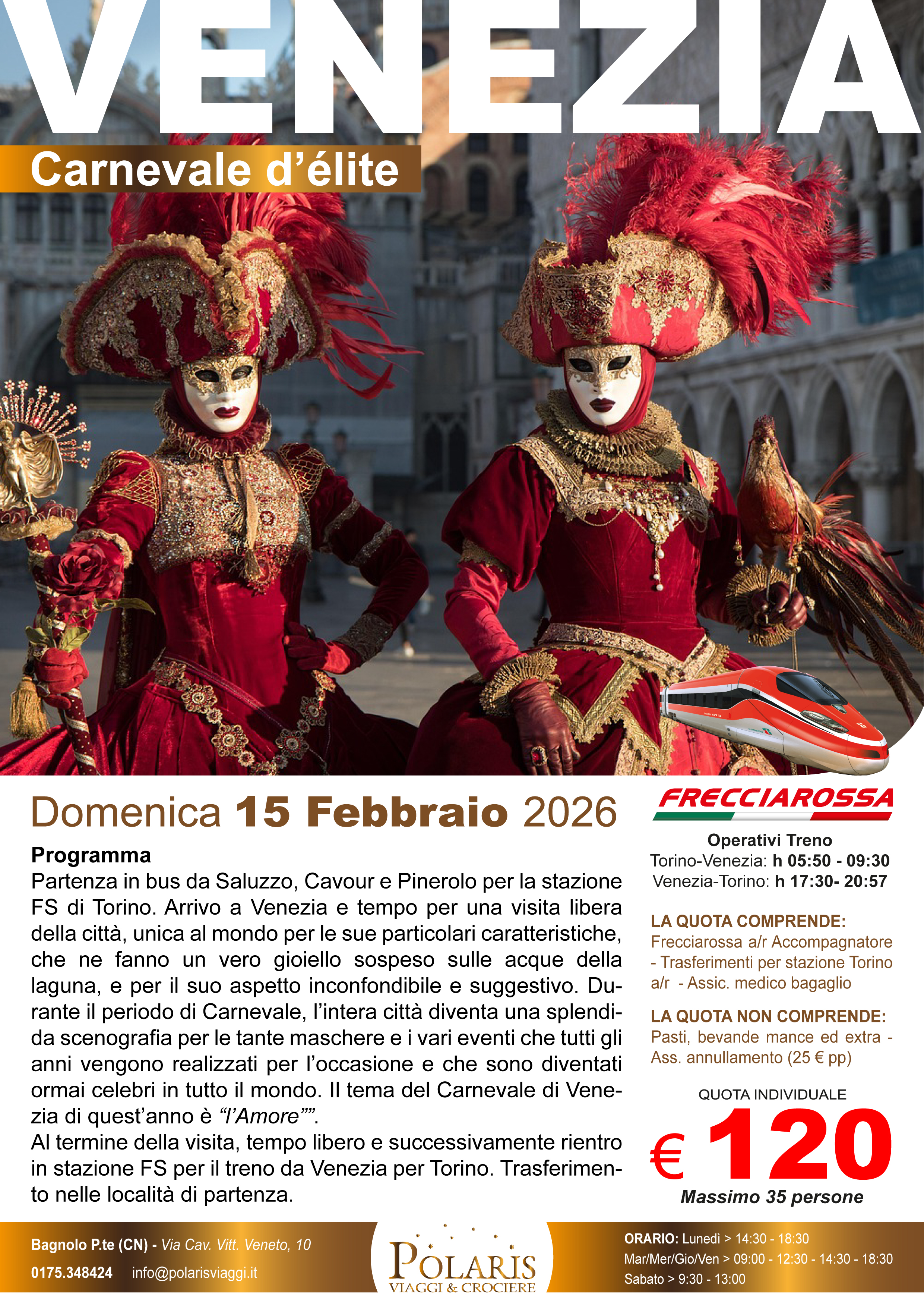 Partenza in bus da Saluzzo, Cavour e Pinerolo per la stazione FS di Torino. Arrivo a Venezia e tempo per una visita libera della città, unica al mondo per le sue particolari caratteristiche, che ne fanno un vero gioiello sospeso sulle acque della laguna, e per il suo aspetto inconfondibile e suggestivo. Durante il periodo di Carnevale, l’intera città diventa una splendida scenografia per le tante maschere e i vari eventi che tutti gli anni vengono realizzati per l’occasione e che sono diventati ormai celebri in tutto il mondo. Il tema del Carnevale di Venezia di quest’anno è “l’Amore””.