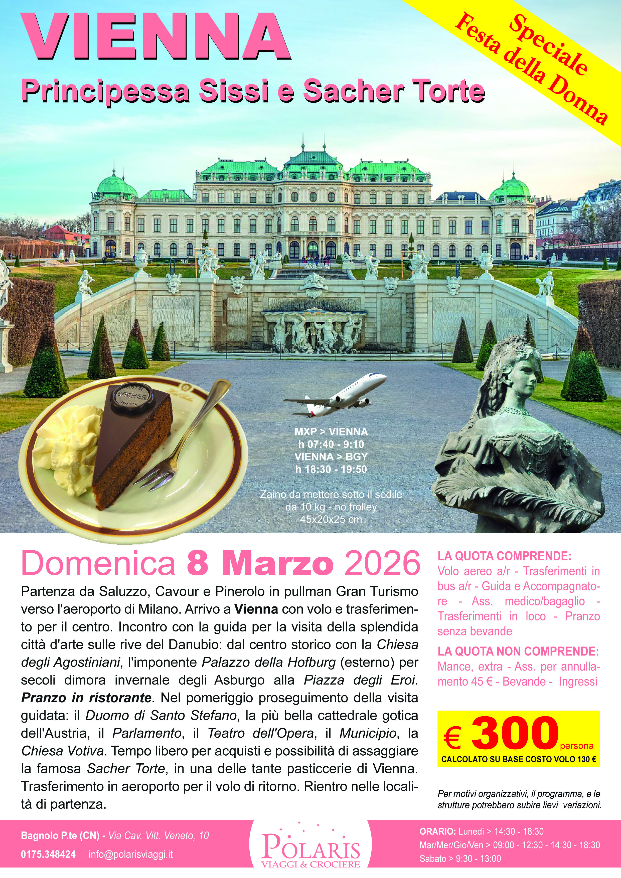 Partenza da Saluzzo, Cavour e Pinerolo in pullman Gran Turismo verso l'aeroporto di Milano. Arrivo a Vienna con volo e trasferimento per il centro. Incontro con la guida per la visita della splendida città d'arte sulle rive del Danubio: dal centro storico con la Chiesa degli Agostiniani, l'imponente Palazzo della Hofburg (esterno) per secoli dimora invernale degli Asburgo alla Piazza degli Eroi. Pranzo in ristorante. Nel pomeriggio proseguimento della visita guidata: il Duomo di Santo Stefano, la più bella cattedrale gotica dell'Austria, il Parlamento, il Teatro dell'Opera, il Municipio, la Chiesa Votiva. Tempo libero per acquisti e possibilità di assaggiare la famosa Sacher Torte, in una delle tante pasticcerie di Vienna. Rientro in aeroporto per il volo di ritorno. Rientro nelle località di partenza.