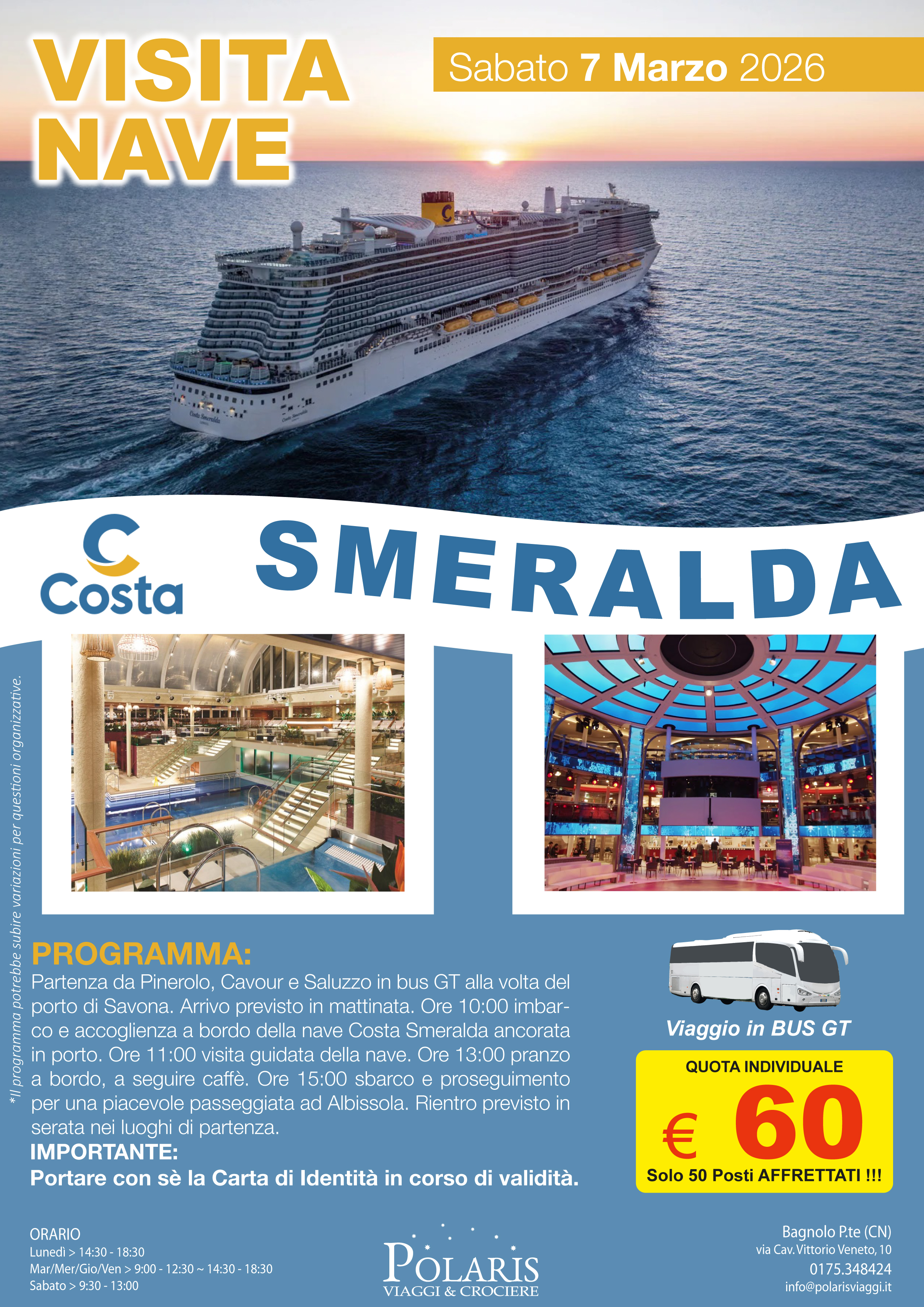 Partenza da Pinerolo, Cavour e Saluzzo in bus GT alla volta del porto di Savona. Arrivo previsto in mattinata. Ore 10:00 imbarco e accoglienza a bordo della nave Costa Smeralda ancorata in porto. Ore 11:00 visita guidata della nave. Ore 13:00 pranzo a bordo, a seguire caffè. Ore 15:00 sbarco e proseguimento per una piacevole passeggiata ad Albissola. Rientro previsto in serata nei luoghi di partenza.