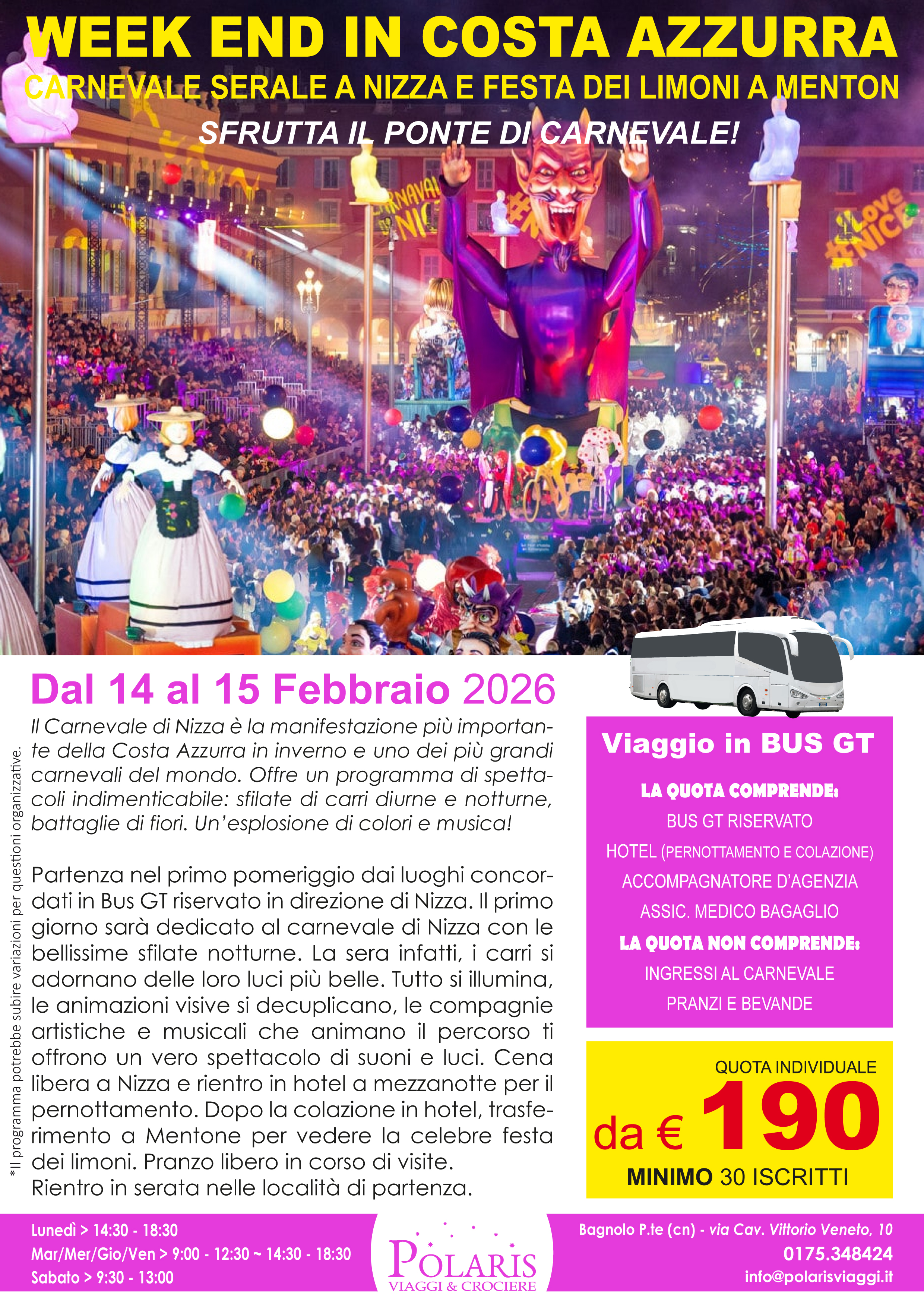 Partenza nel primo pomeriggio dai luoghi concordati in Bus GT riservato in direzione di Nizza. Il primo giorno sarà dedicato al carnevale di Nizza con le bellissime sfilate notturne. La sera infatti, i carri si adornano delle loro luci più belle. Tutto si illumina, le animazioni visive si decuplicano, le compagnie artistiche e musicali che animano il percorso ti offrono un vero spettacolo di suoni e luci. Cena libera a Nizza e rientro in hotel a mezzanotte per il pernottamento. Dopo la colazione in hotel, trasferimento a Mentone per vedere la celebre festa dei limoni. Pranzo libero in corso di visite.